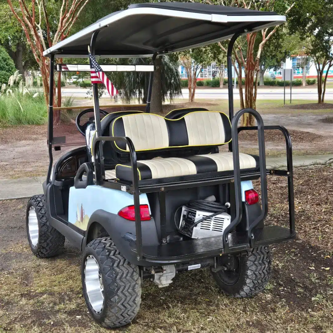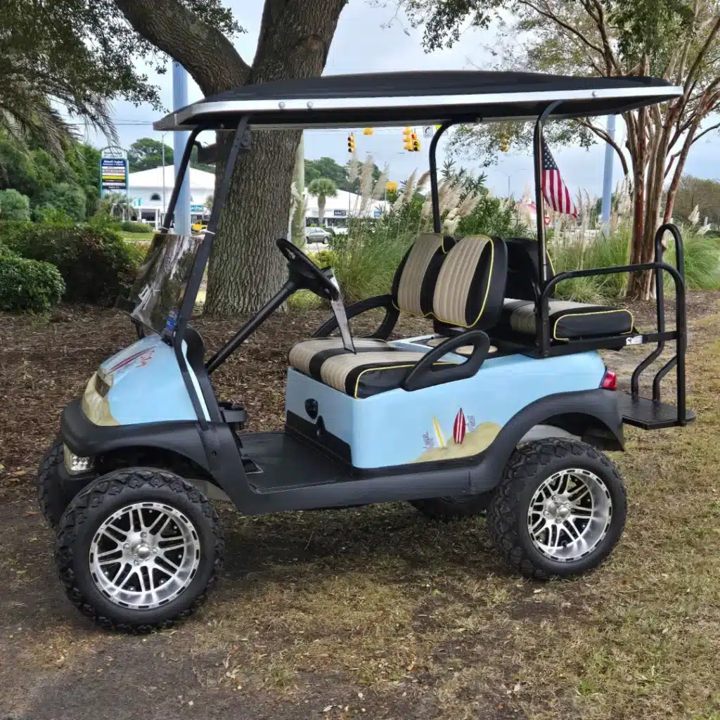 This affordable cart comes equipped with new batteries, delivering reliable power and long-lasting performance. The 4-passenger Club Car Precedent stands out with a custom sky-blue paint job and beach decals, paired with black and tan seats featuring yellow piping. A black extended roof provides extra shade, flip-down back seats and the aluminum frame ensures a lightweight, rust-resistant build.