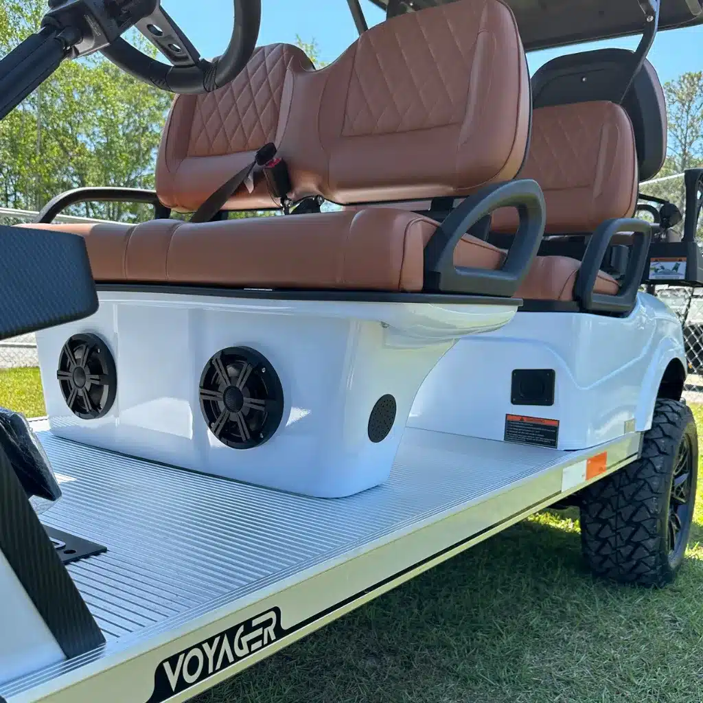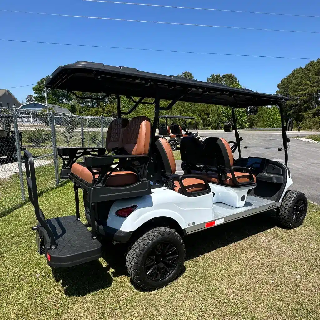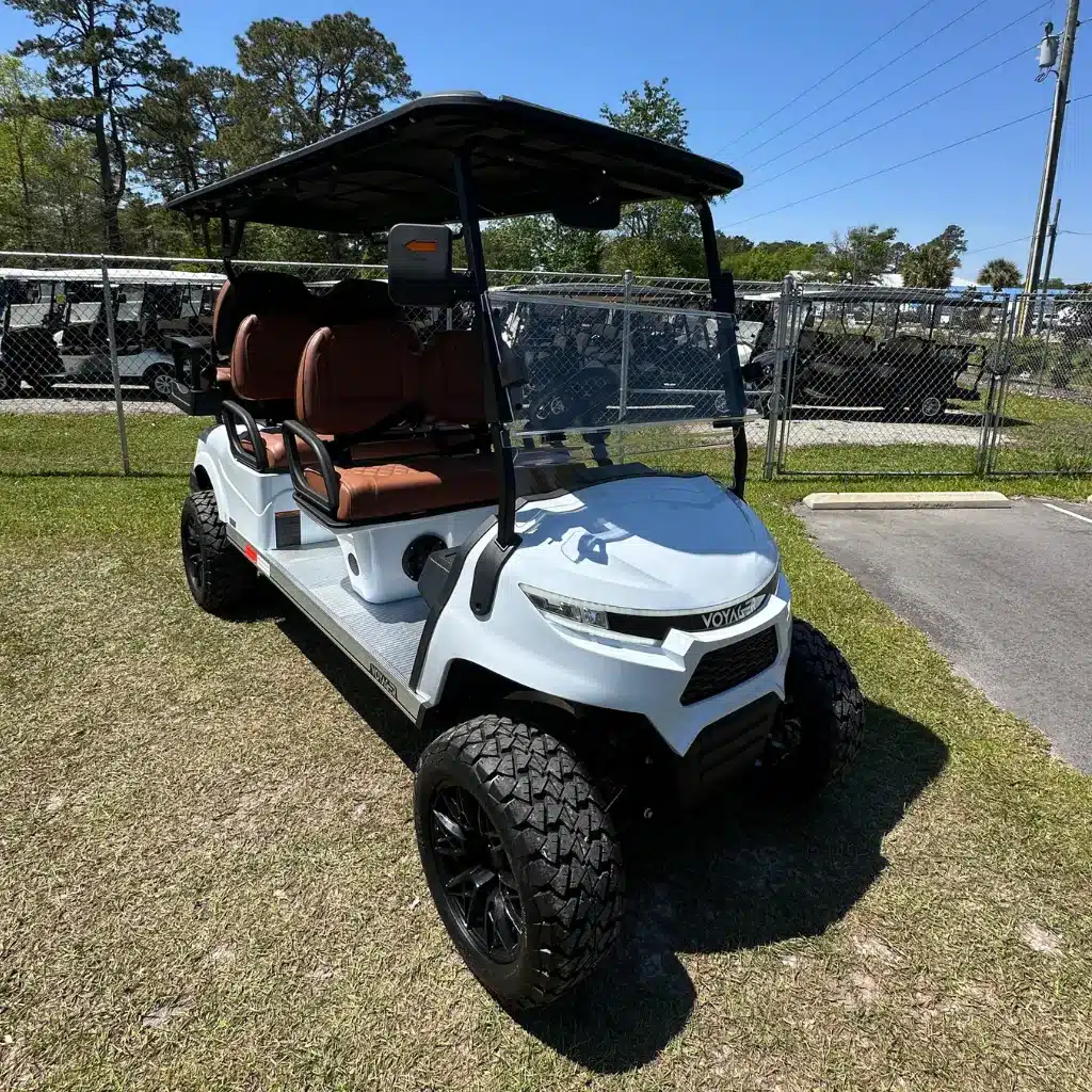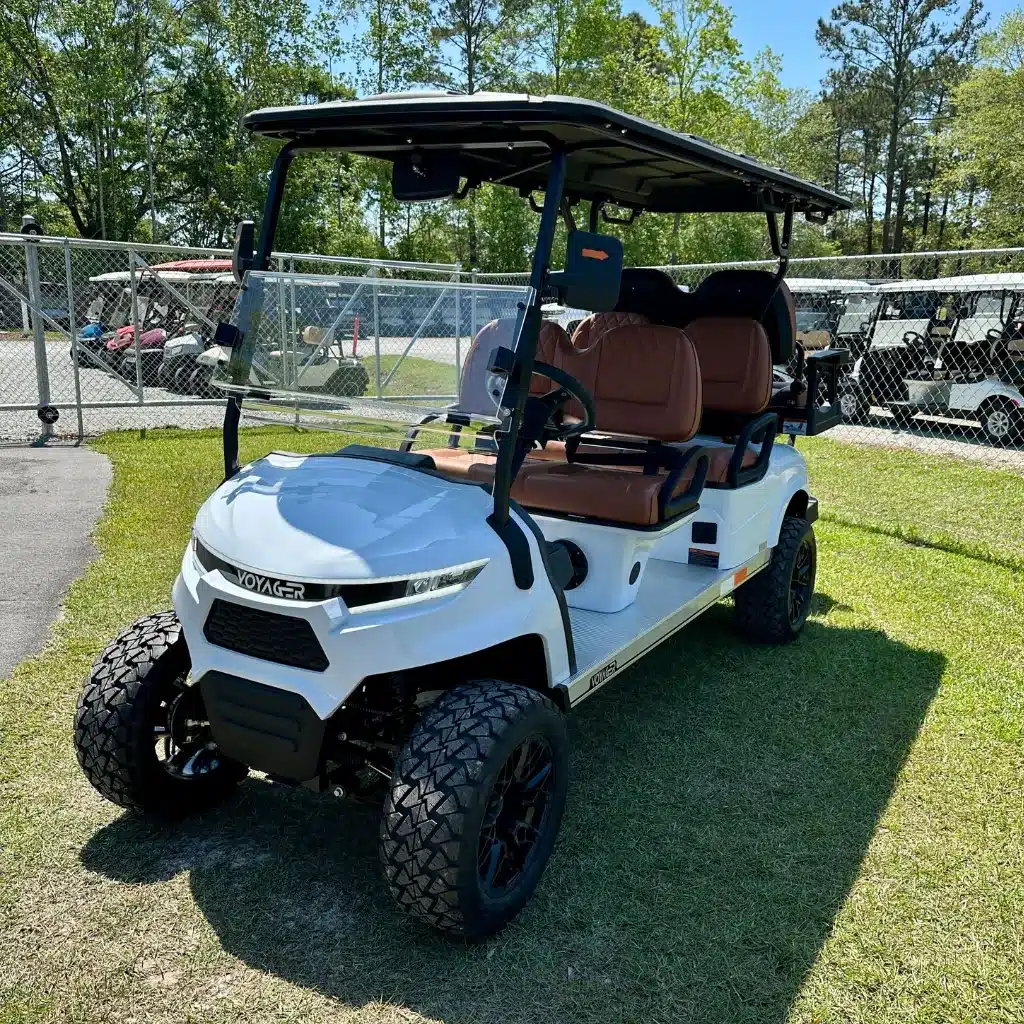 The Voyager Patriot White 6 Passenger model combines innovation, practicality, and rugged style. This street-legal, lifted golf cart boasts a robust aluminum frame and eye-catching premium White finish. Its spacious, ergonomic design features hand-stitched black contoured seats, offering both comfort and elegance. The flip-down rear seat with cup holders adds functionality for passengers. Equipped with a 72V Eco Battery Lithium system and AC power, the Patriot delivers excellent torque and smooth performance, even on rough terrain, thanks to its lifted 14″ all-terrain wheel package. The onboard charger simplifies maintenance, and the 10″ multimedia display with Apple CarPlay/Android Auto integration keeps drivers connected. The reverse camera, LED lights, retractable seat belts, and side mirrors with turn signals ensure a safe, modern driving experience. Backed by a 2-year full coverage warranty and an 8-year battery warranty, the Voyager Patriot is designed to handle any adventure with power, performance, and style.